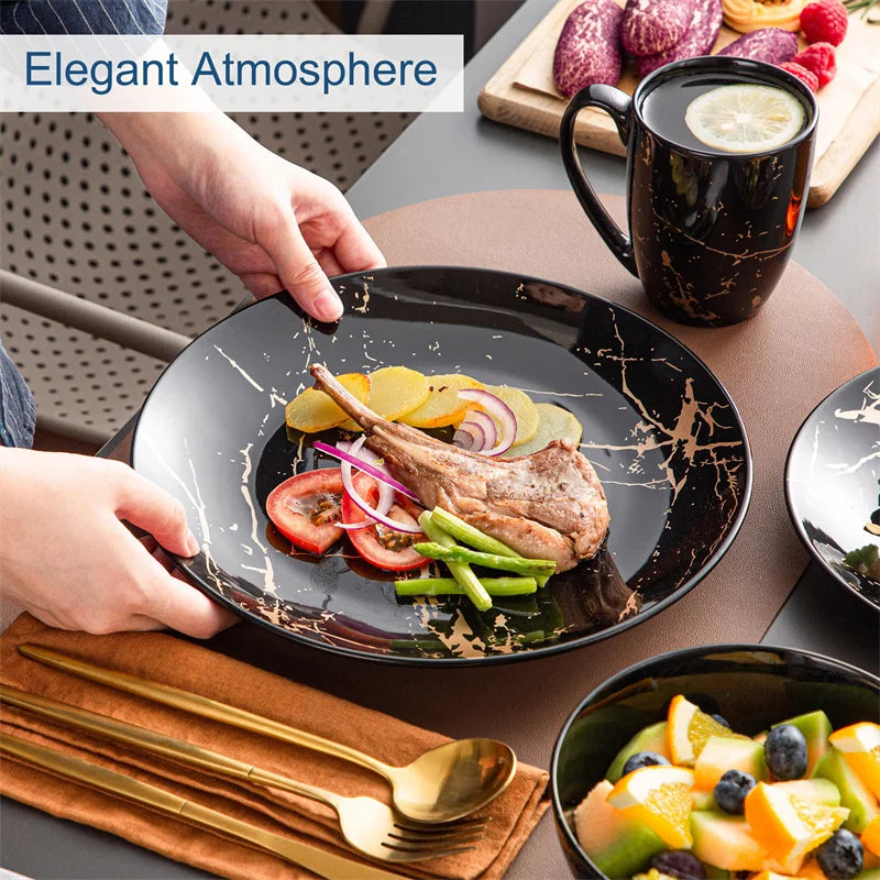 Immerse your dining moments in modern elegance with the 16 Piece Black Porcelain Set With Gold Splash. This dinnerware combines a deep, sophisticated black porcelain with a bold gold splash finish, delivering a striking, contemporary look that instantly elevates any table setting. The glossy glaze adds a luxurious shine while offering a smooth, easy-to-clean surface.