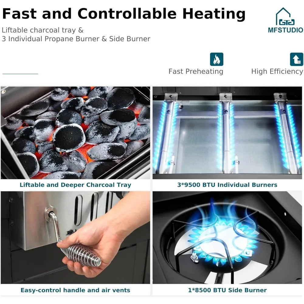 Experience ultimate outdoor cooking versatility with the 3 In 1 Gas And Charcoal Grill Combo With Side Burner Propane. This dual-fuel grill blends propane gas grilling for speed and precision, charcoal grilling for deep, smoky flavor, and a dedicated side burner to simmer sauces or boil sides—everything you need for backyard feasts in one compact unit.