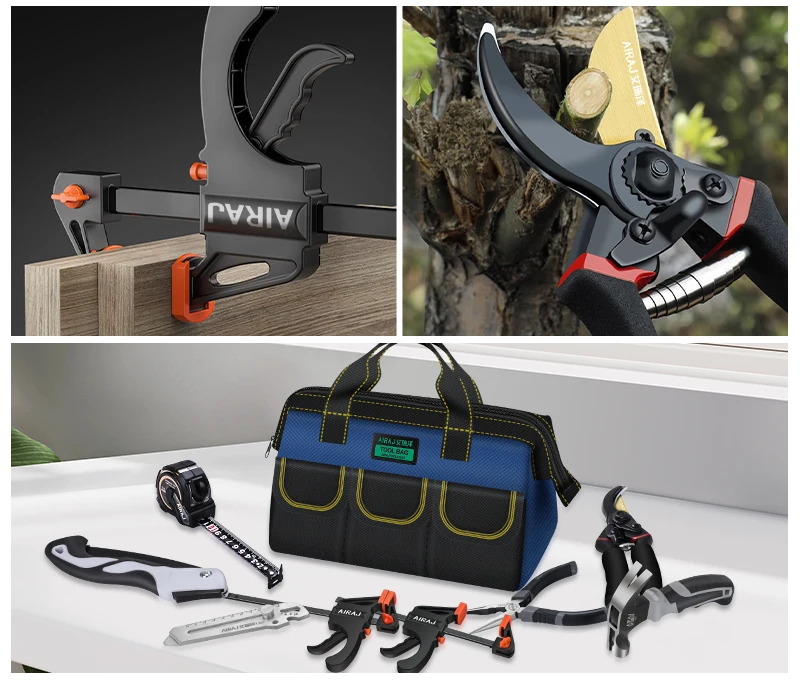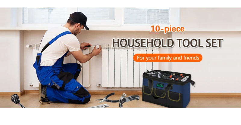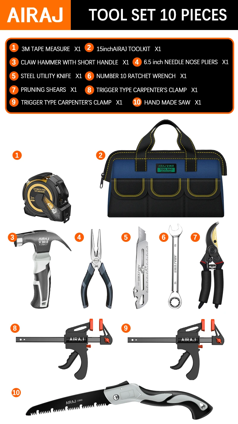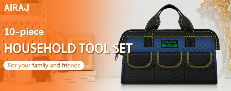 AIRAJ 10Pcs Household Tool Set. With 13 inch Tool Bag-Wide Mouth and Multiple Pockets Design.Garden,Home,Office Small Tool