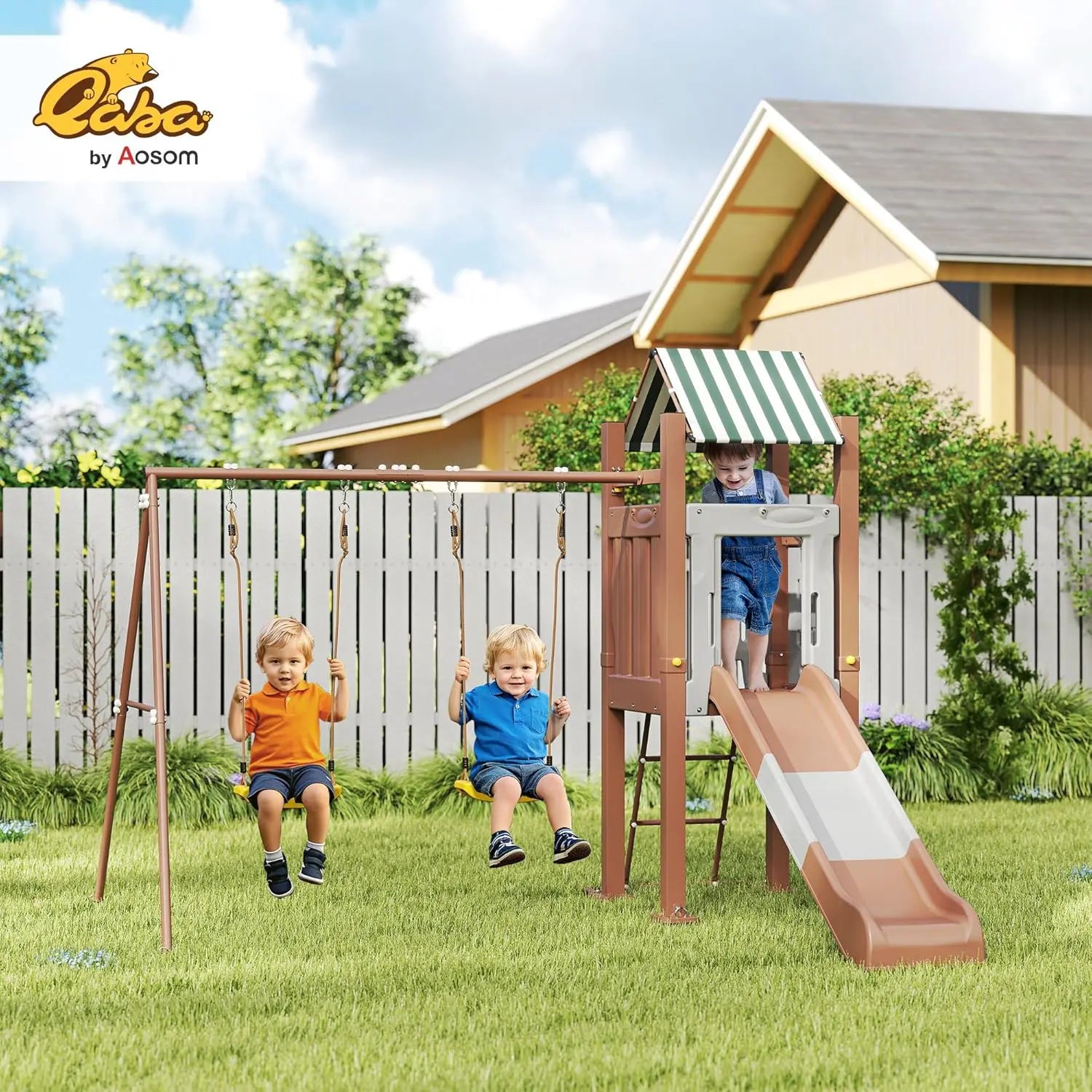 - Complete Outdoor Playset: Includes a 6.2 ft slide, two height-adjustable swings, a fortified fort with canopy, and a climbing ladder for varied, multi-activity play. Supports up to three kids with a total load of 297 lbs.