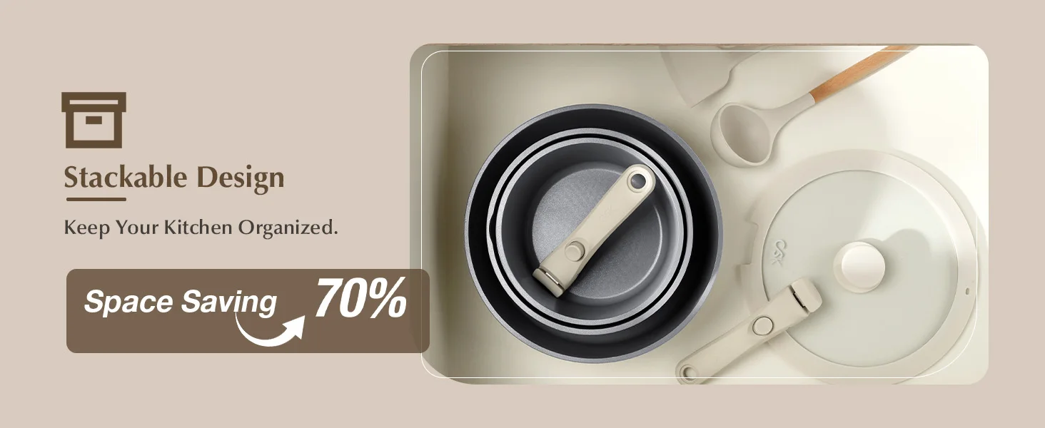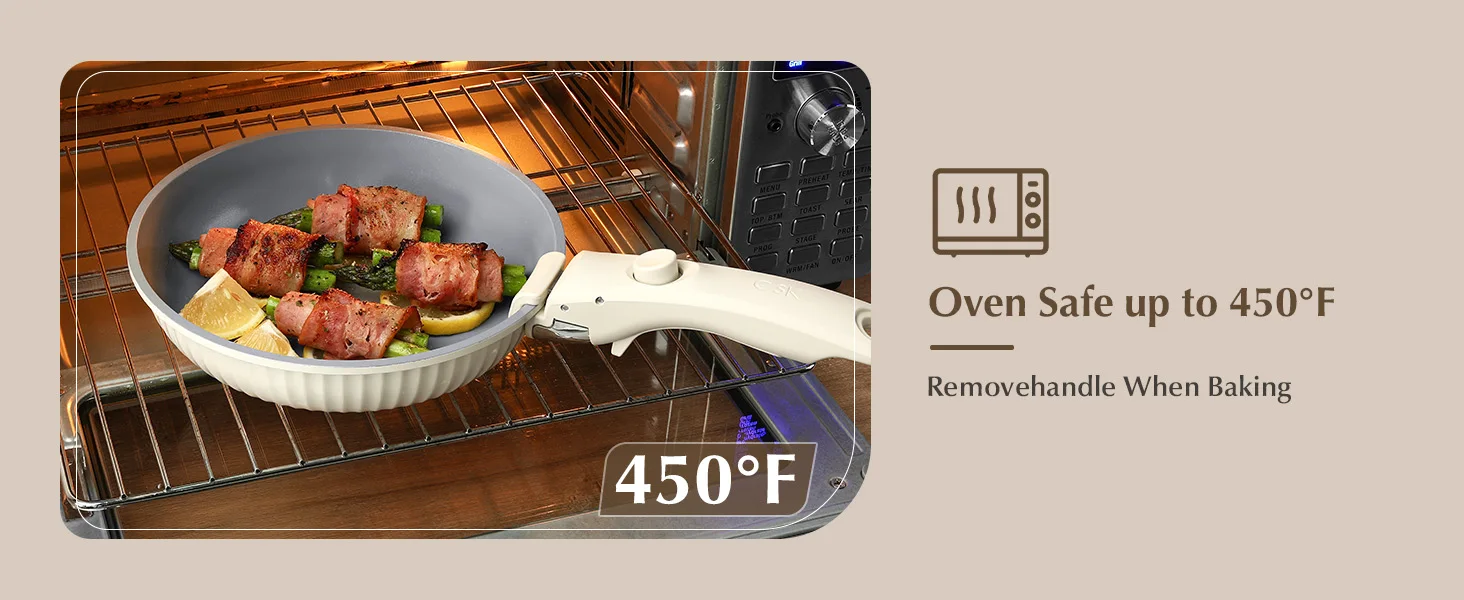 Effortless Cleaning: Dishwasher safe cookware set for effortless clean up. Saving you time and labor on cleaning with our nonstick cookware set. Easily remove the handle for a quick and thorough wash, keeping your cookware and kitchen spotless.