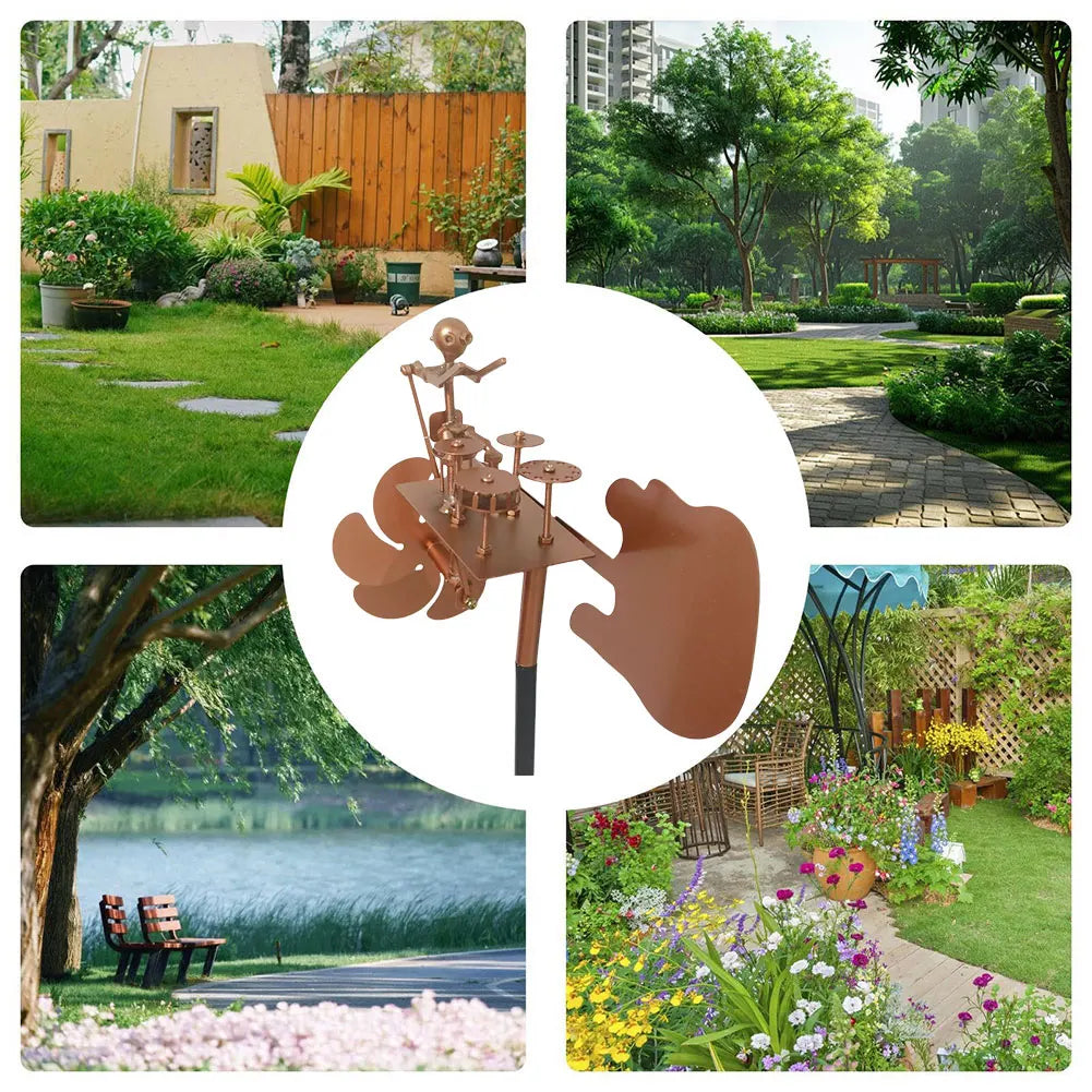 Metal Drummer Windmill Statue Beat The Drums with The Wind Decorative Wind Power Rock Art Statue Percussionist Music Figurines and Statues for Garden Yard Patio Lawn Porch Backyard